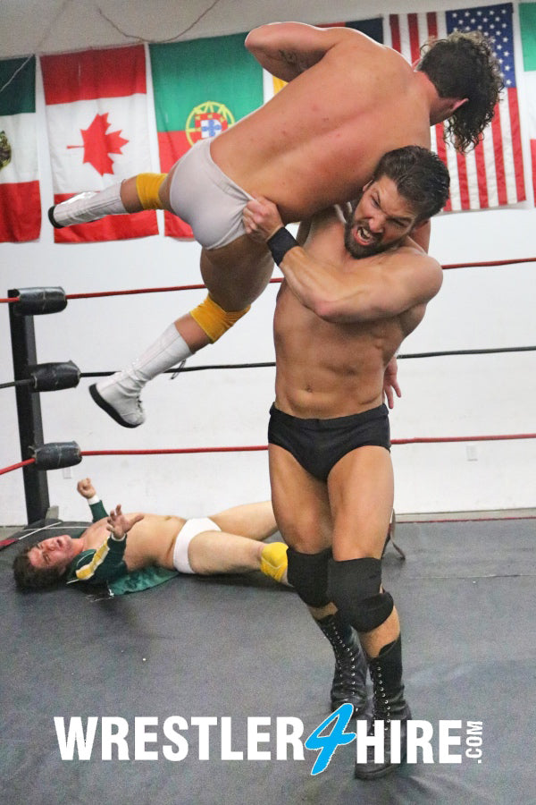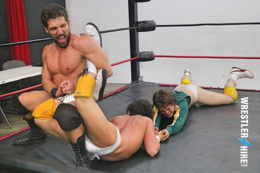 After working on their three holds, Ronnie Pearl enters the ring like a bolt of lightning. He’s looking sexy as f**k in his all black as he goes after both jobbers, screaming out, “CLASS IS IN SESSION, ROOKIES!!!” The brutality begins. Ronnie loves dominating his opponents and this match is no exception. There is little doubt that Ace and Johnny will be Ronnie’s bitches before the match is over. Ronnie goes back-and-forth from one jobber to the other, even body slamming Johnny onto Ace. Trying not to show any favoritism, Ronnie then slams Ace onto Johnny. That’s gotta hurt! The punishment of these two wimps just goes on and on. Ronnie shows no mercy. Poor Johnny never even gets his ring jacket off. He does manage to get it unzipped, revealing his 10 or 12 chest hairs, but it never comes off.