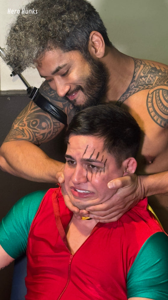 Beacon Scout (Javier the Hunk) is cuffed to a chair deep inside Virex’s lair—and he knows he’s in big trouble. His cries echo through the shadows until Virex (Christian Thorn) finally steps forward, slow and deliberate, admiring the clean-cut, wholesome superhero sidekick confined before him. Beacon Scout isn’t going anywhere.