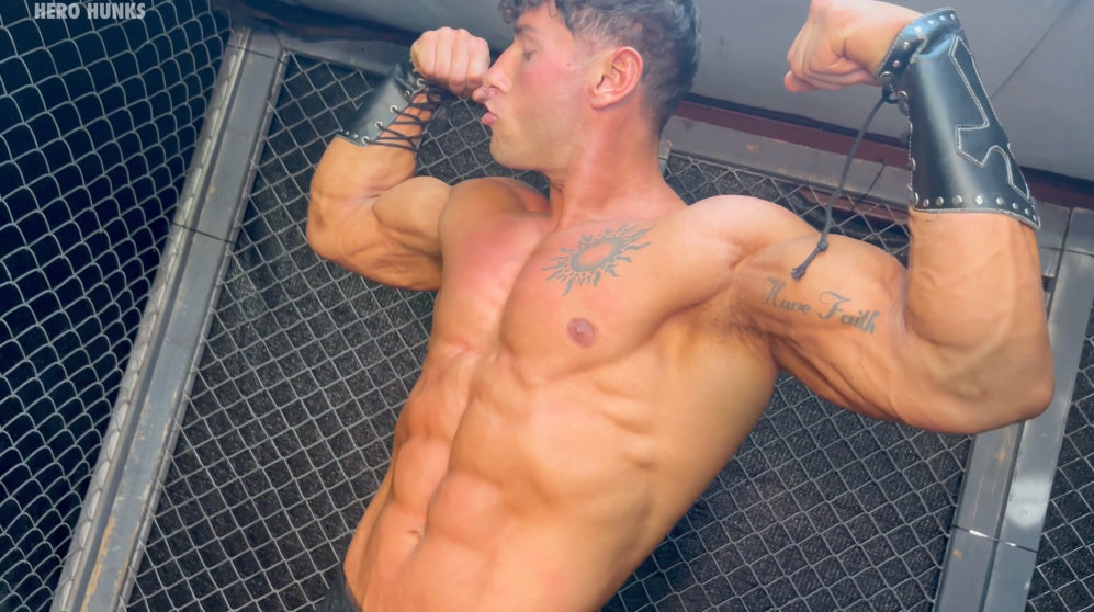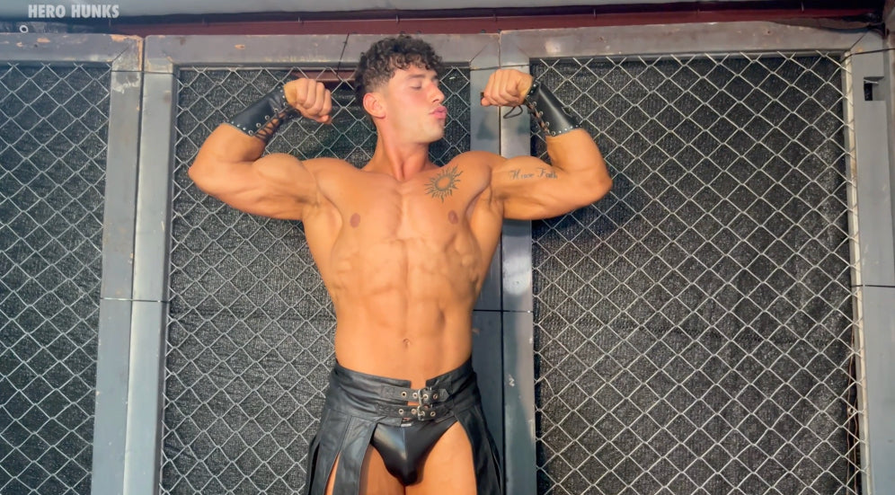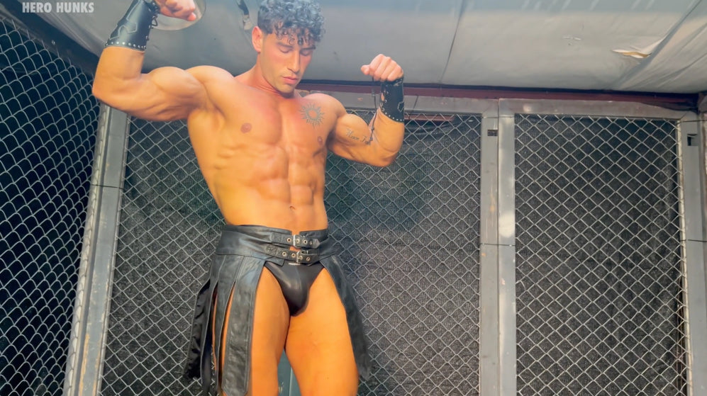 The Gladiator (played by Bronco) looks like he stepped out of Ancient Greece—chiseled from marble, his leather kilted armor barely hiding anything, showing off every inch of his peak, competition-ready body. From the shadows lurks the villain, Cloaked Creeper (played by Max Ryder). He licks his lips and sneaks in close, running his leather-gloved hands over the smooth, muscled torso of the Gladiator, admiring every cut and curve before the fight even begins.