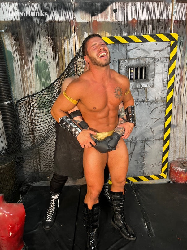 The battle is fierce and brutal. Dr. Maniacal wastes no time, going straight for Golden Atlas's precious privates, squeezing until it looks like they'll burst. The villain knows how to handle handsome heroes, delivering relentless down-under assaults and bending our hero over for repeated slaps to his hard-as-a-rock glutes, leaving red handprints across his butt cheeks.