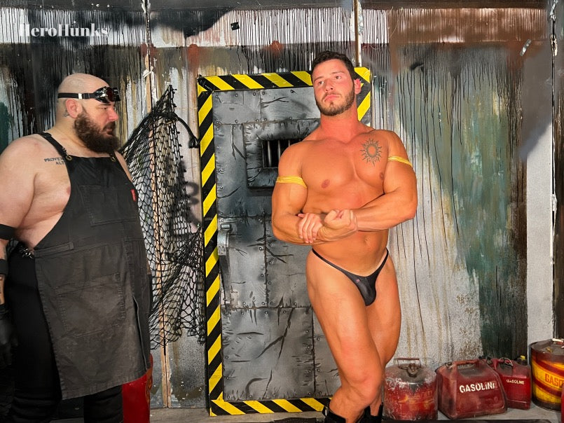 The muscular but naïve young hero is instantly, mercilessly manhandled and abused...physically and verbally...by "The Handsome Monster" and soon finds himself nothing more than another of the twisted physician's brutalized and humiliated victims. But The Good Doctor is not done with his latest plaything yet! After his defeat, Golden Atlas regains consciousness strapped to a rickety operating table where he is further tortured and tormented by Maniacal. The burly, bearish brute shows his captive absolutely no mercy, and...living up to his moniker...chuckles maniacally as he menacingly toys with the bound, hapless, squirming muscle boy. In the third act of this cinematic saga, we see Golden Arrow after he's suffered through a truly diabolical transformation...whatever Dr. Maniacal's procedure was, he has now reduced the former hero to nothing more than his mindless minion. The debased super-slave now willingly submits to the wicked supervillain's every command...obediently kissing the bad guy's boots, worshiping the big man's superior muscles, and even properly acknowledging Dr. Maniacal as his MASTER! Soon, The Ultimate Supervillain will capture, conquer, and enslave ALL pathetic superhero do-gooders and create from their ranks an army of mindless super-minions to do his bidding and help him complete his relentless quest for world domination...HA HA HA HA HA!!!