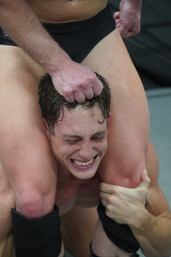 Suddenly, Calvin switches his tactics, lifting, hoisting, dragging, and throwing Scrappy around like he’s no heavier than an old rag. Knees to balls are his next demented tactic, before he launches into full pro mode...only to always pull Scrappy back into a sleeper hold by his hair. Get ready to see muscular Scrappy begging, cursing, sobbing in total desperation, while the once sweet seeming Calvin regards his opponent’s pain with psychopathic removal from the situation. So twisted! And not to be missed if you’re into a sweaty facesitting final count.