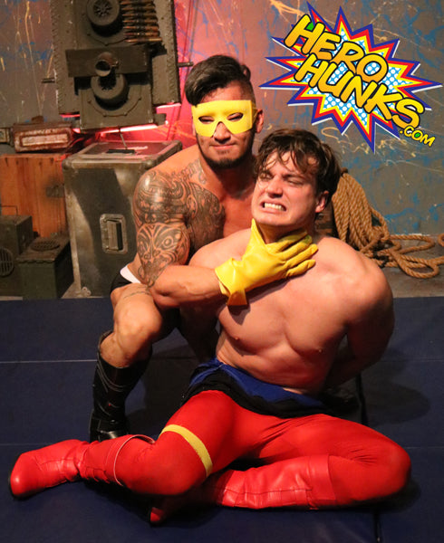 The pair locks up, muscle against muscle, good vs. evil. Fists fly, abdomens are pounded, booted feet and legs lock up in tight fury, hot asses clench as the handsome hunks roll and wrench each other apart. Steel Boy throws Tsunami into a wall, forces him into a full nelson, and lectures him endlessly about truth, justice, and the American way.