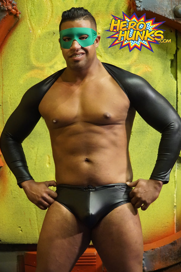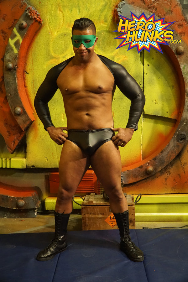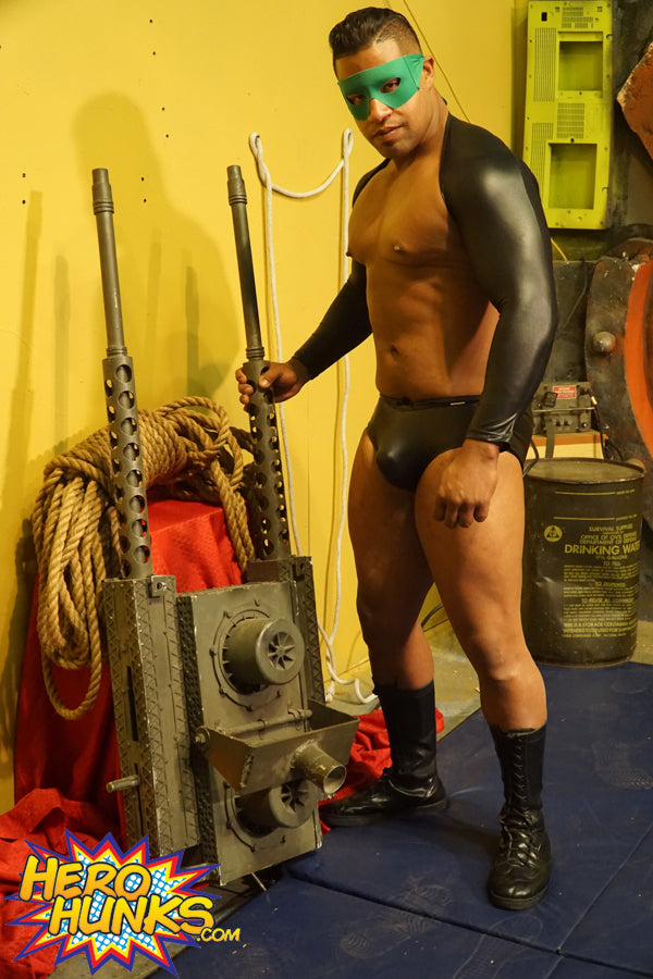 Super villain Krypto Crunch (Gabe Steel) has invaded the Malevolent Lair in his most daunting black leather, nipples on high alert in his relentless search of the annihilator weapon. Nobody can stop him now...except maybe a old school boy scout like Steel Man (Scrappy). The smaller Steel Man hoists the bigger villain into the air with ease, as if he weighs no more than a feather, then blasts his leather-clad balls with a brutal fist of steel.