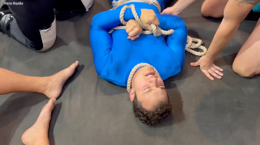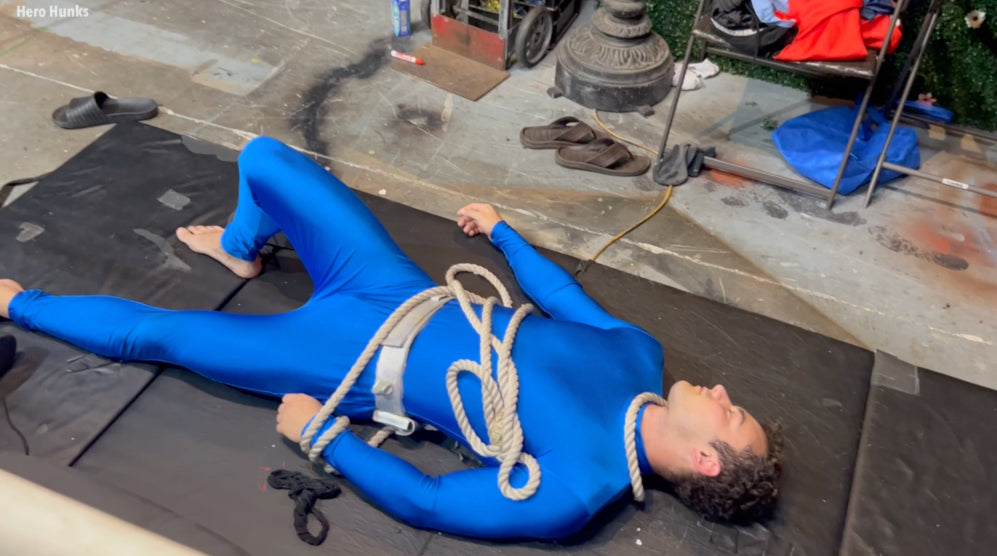Superlad (played by Travis Maverick) is pulled into the wrestling ring in his blue bodysuit and wrists cuffed with white rope. The bad guys light up with glee at what is in store for Superlad. They waste no time getting to work...and devious play. Superlad is stripped and dominated for 30 minutes.