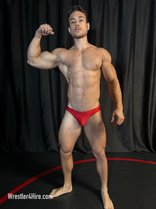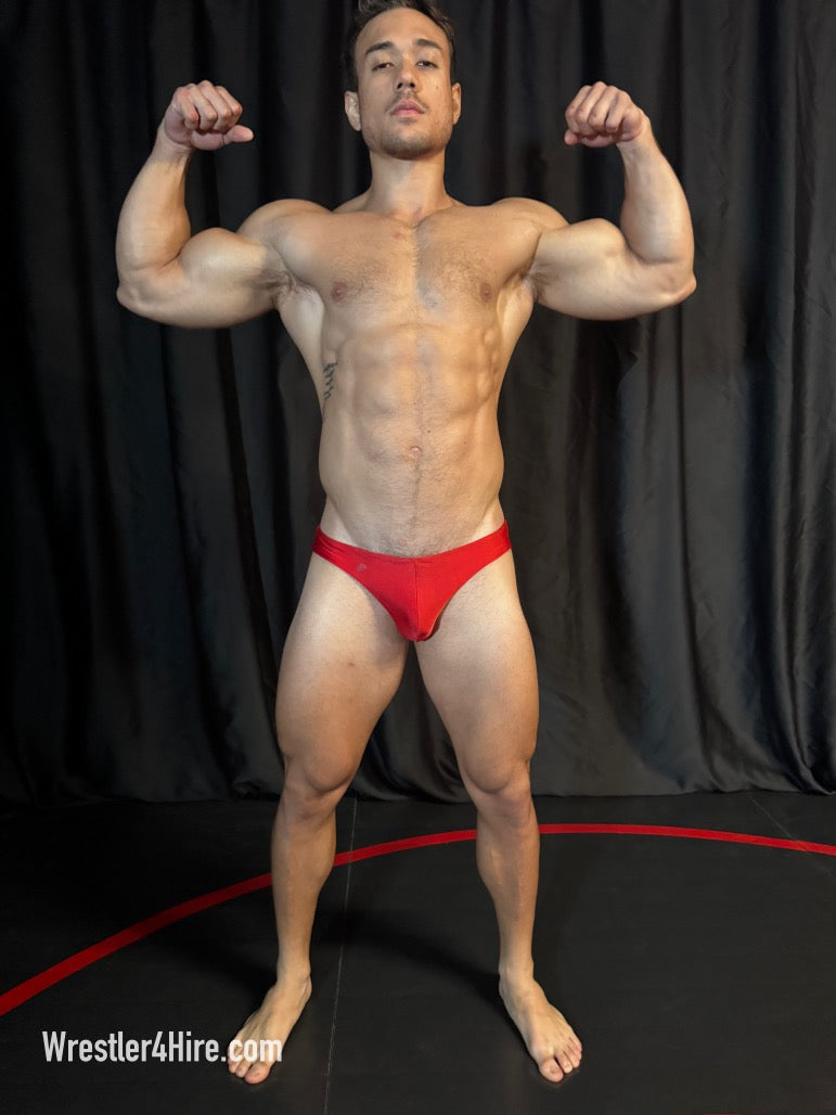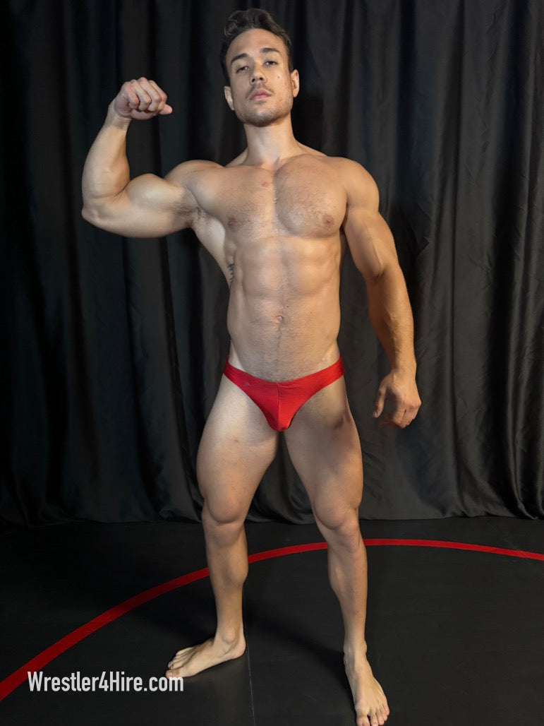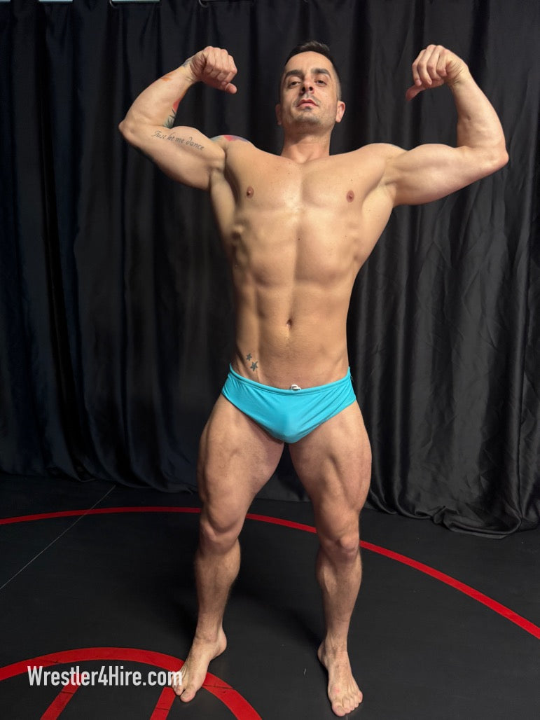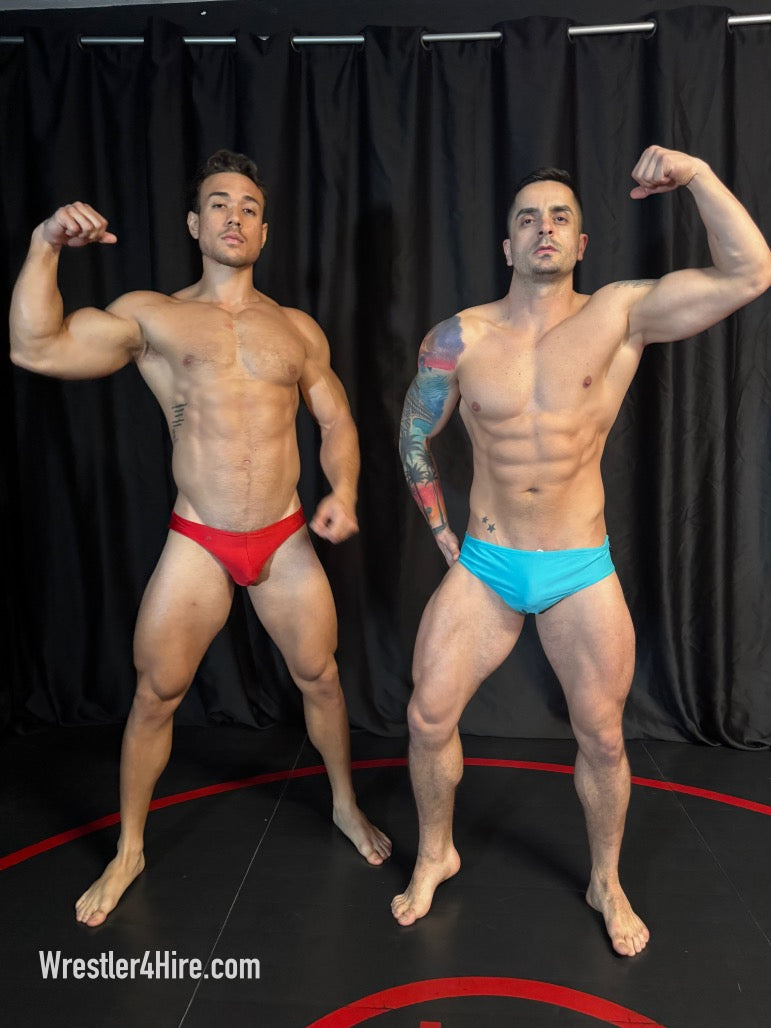 Opposite him stands Camillo, a South Florida stud in powder blue trunks with a bit of a resembelence to Marco Thunder, his abs carved to perfection, his pecs firm and round. Side by side, these hunks are a visual feast—thick quads, broad shoulders, and the kind of muscular symmetry that makes this match impossible to look away from. There’s only one question left: Who’s the alpha?